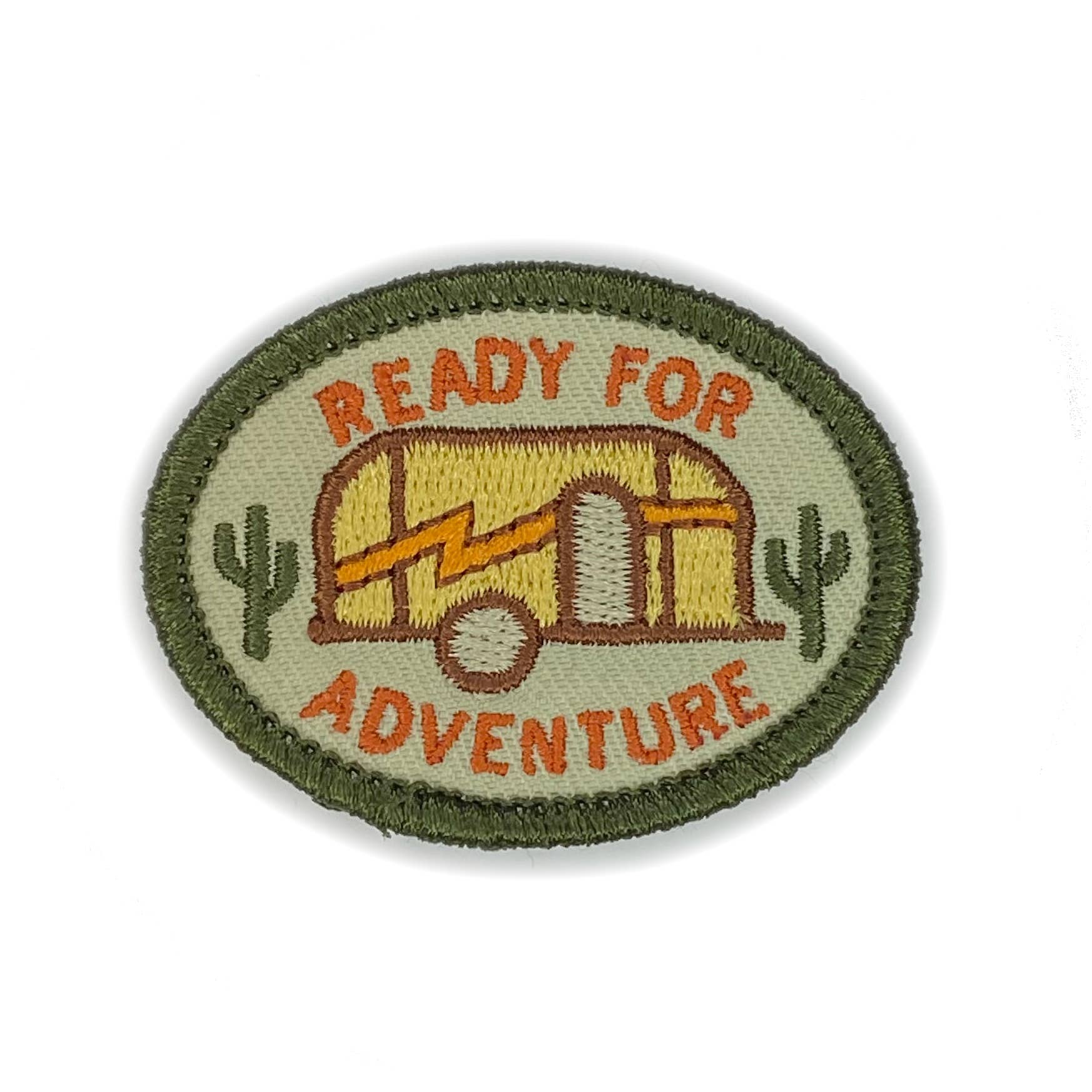 2” x 1.5” Embroidered iron-on patch featuring a yellow trailer and cacti.