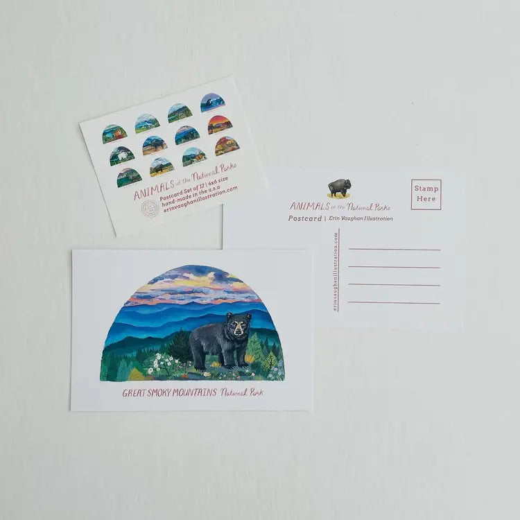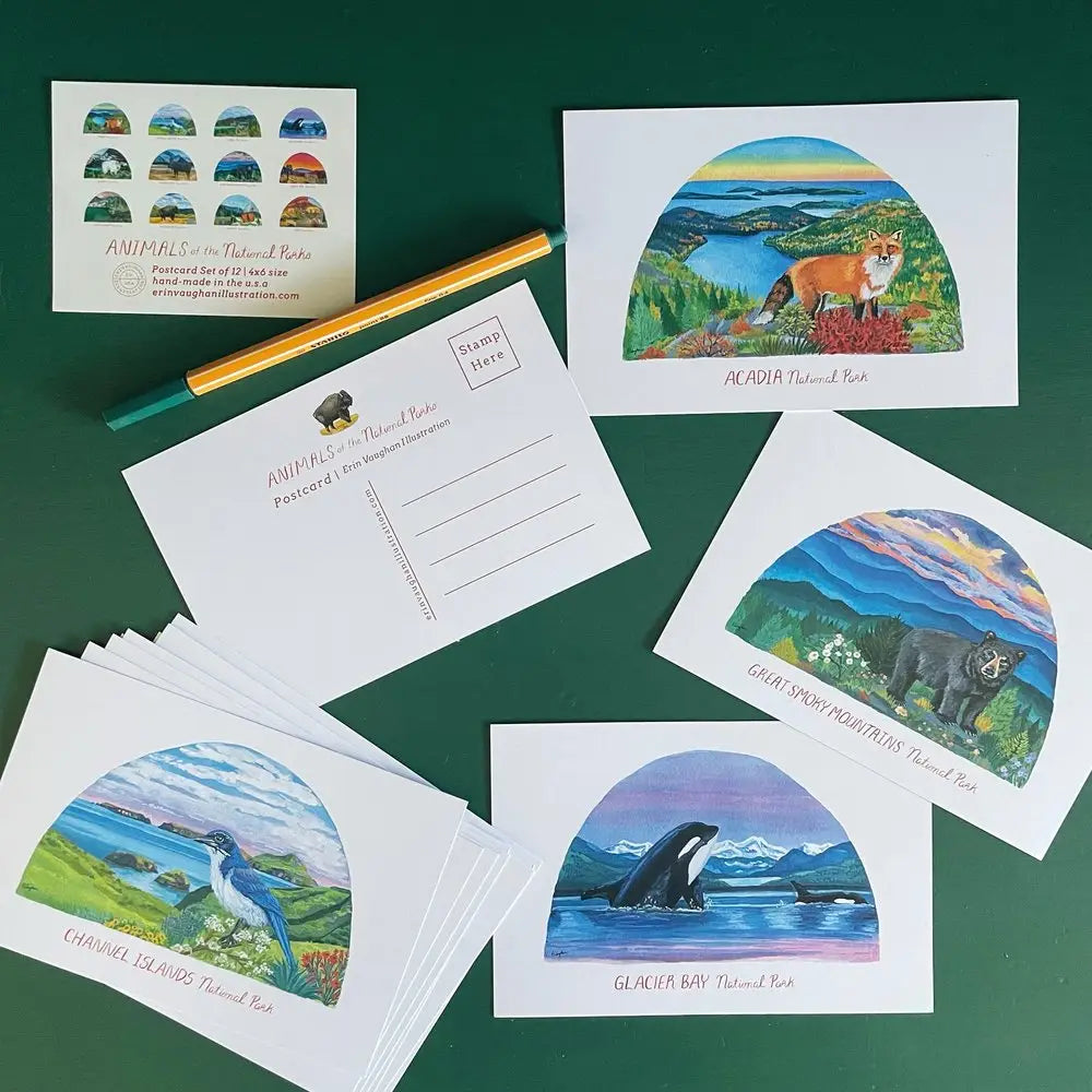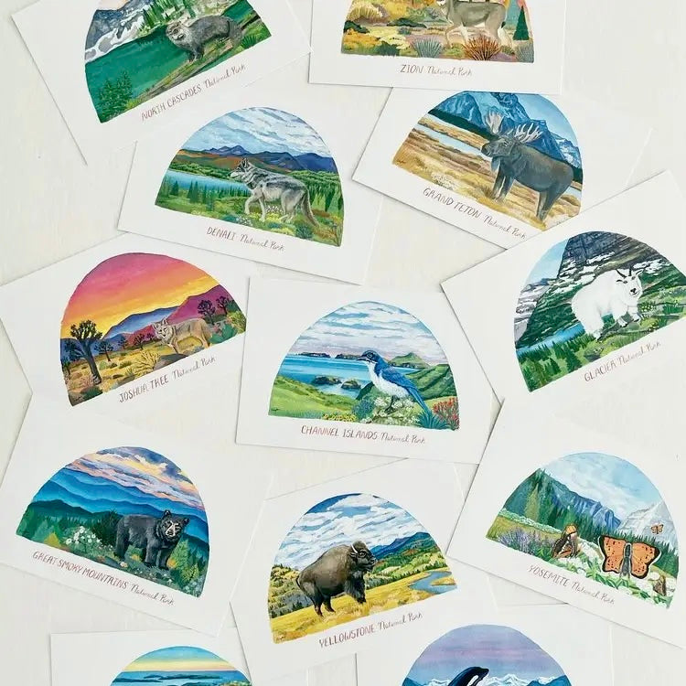 - 12 different animal postcards including: Acadia Fox, Channel Island Scrub Jay, Denali Wolf, Glacier Bay Orca, Glacier Mountain Goat, Grand Teton Moose, Great Smoky Mts Black Bear, Joshua Tree Coyote, North Cascades River Otter, Yellowstone Bison, Yosemite Alpine Butterfly, and Zion Deer Mule