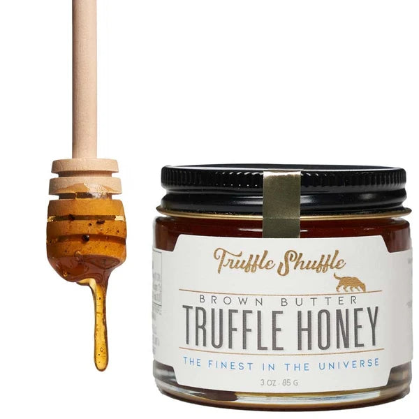 Gorgeous wildflower honey from Napa Valley plus authentic black truffle and toasty brown butter make this unique honey truly unforgettable. Perfect for: Cheese or charcuterie boards. Amazing on grilled pork. Baked sweet potato. Even vanilla ice cream. Size: 3 oz.
