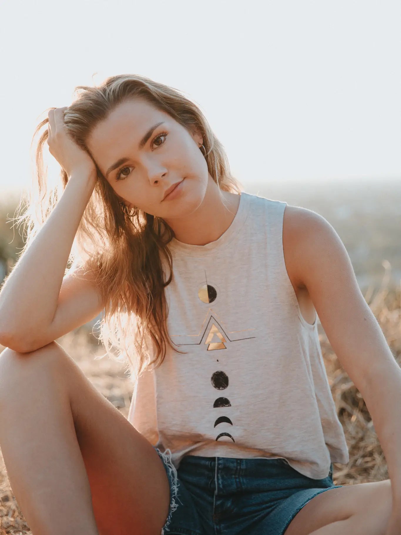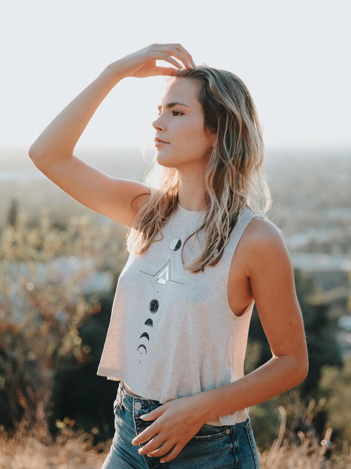 Hand drawn design by Richard Bao paying tribute to the fragile balance between dark and light. The daybreak print represents the fleeting moment when night moves into day, the first light. Moon phases printed in charcoal mixed with gold foil above, all printed on our favorite soft crop tank (oatmeal) Made in Los Angeles. Size + fit Model wears: size s. Models height: 5'5". Measurements taken from size small. Chest: 17.5". Length: 18.5".