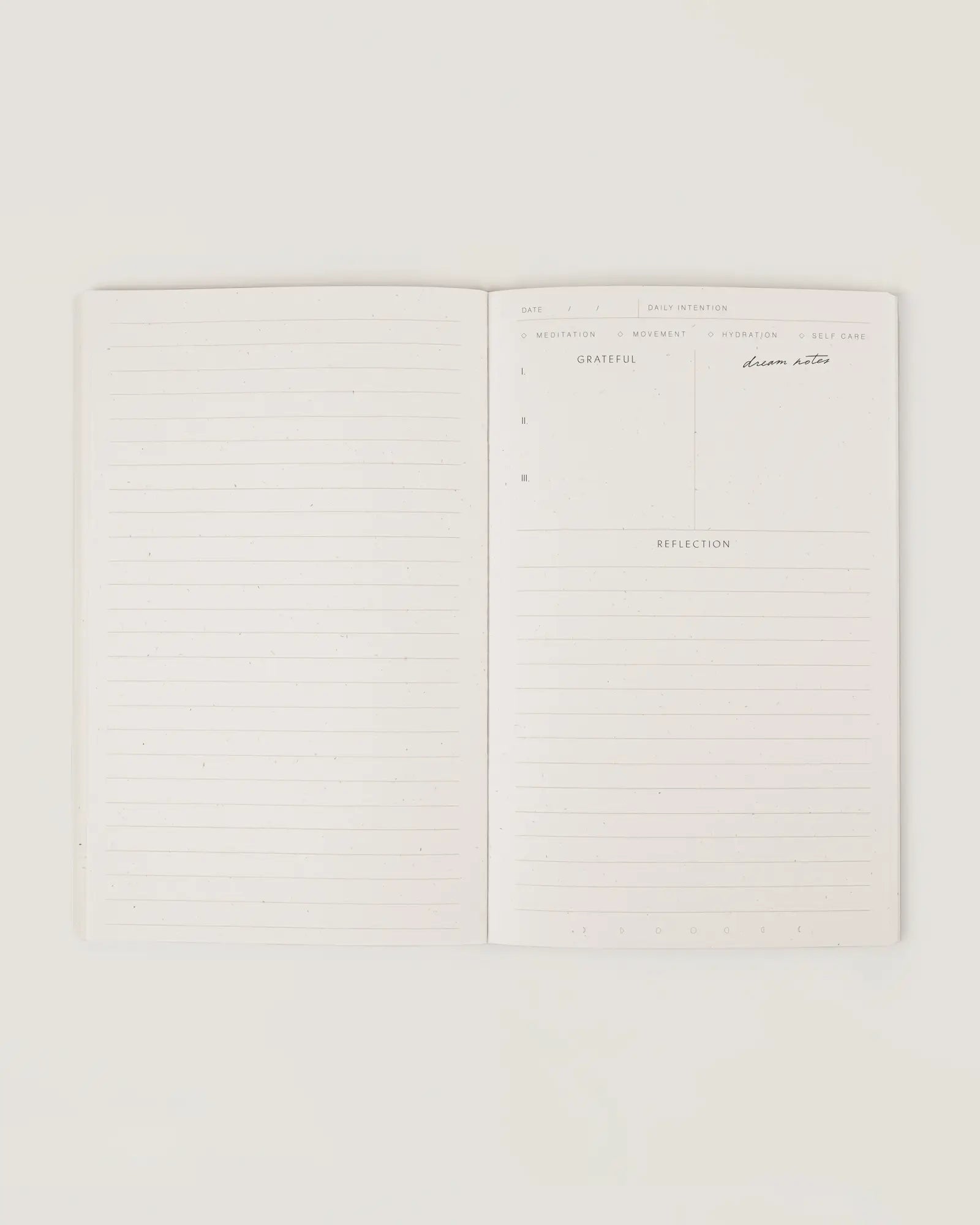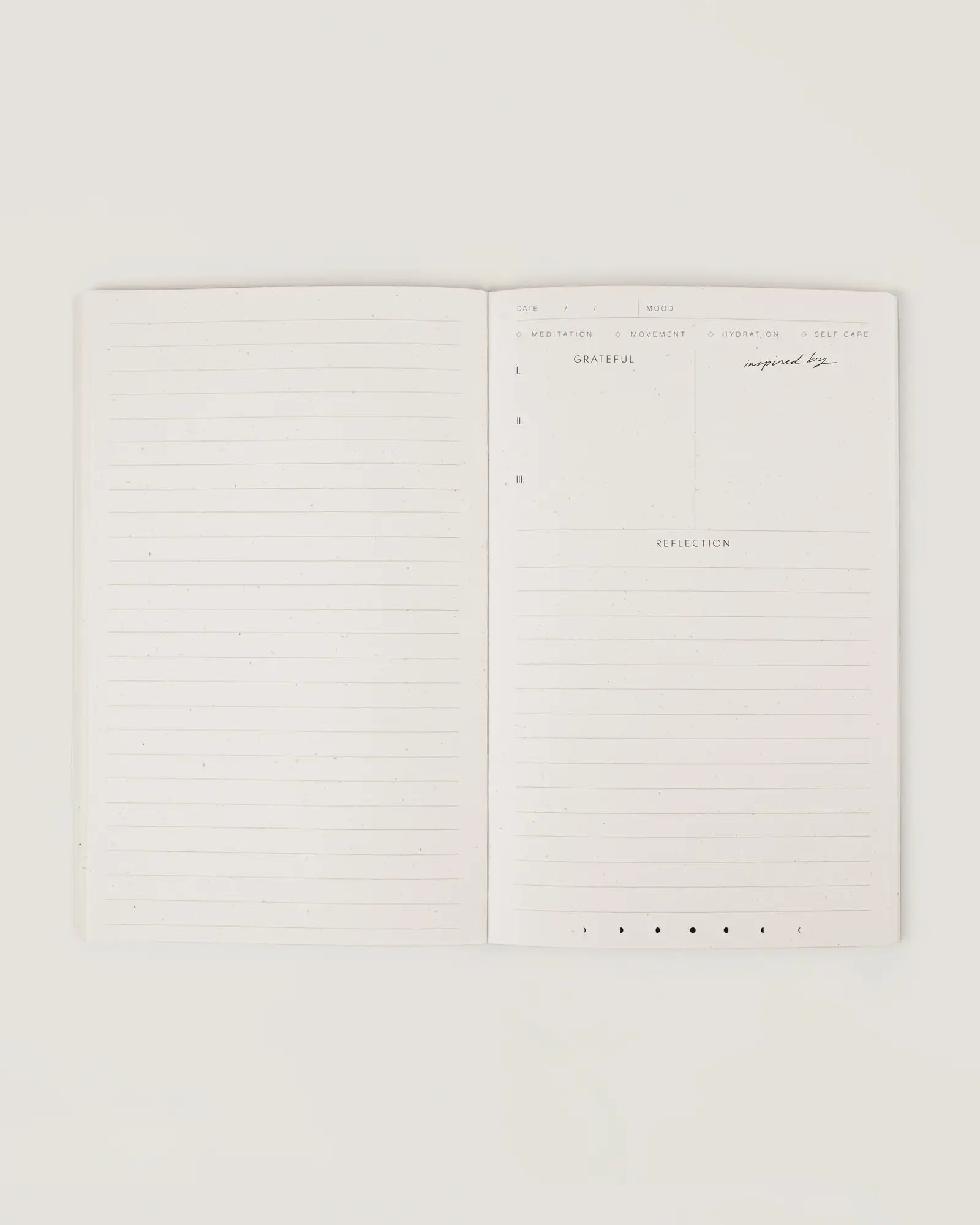 Day: A lightly guided journal intended to support your morning ritual and foster a calm state of mind. By checking with your body, recording your dream, listing the top three things you are grateful for and responding with a journal entry, the Day Journal connects you with your current self and allows you to step into the day with a sense of purpose. 5’’ x 8’’ 75 inner pages of lightly guided morning entry pages. Gold foil stamped cover and inner pages printed on luxe recycled stock made from 30% post-consumer waste. Perfect bound.