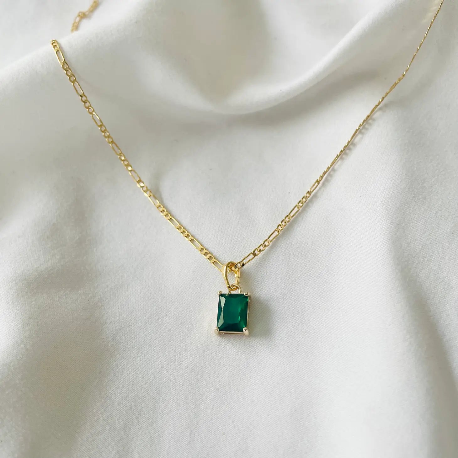 Green Emerald Cut Stone Necklace 24k Gold Filled Figaro Chain 18”