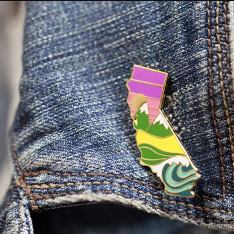Made Welcome to California- The Golden State. It's a place of magic and wonder. From the seas to the sun kissed skies, it's lush valleys to its steep peaks. It is a place that welcomes every creature that walks onto its land, and it's a place I'm so proud to call home. This hard enamel pin features the many faces of California and pays homage to gorgeous landscapes that sweep this great state. It's designed in California and made with shiny gold plating for that added classic golden sparkle!