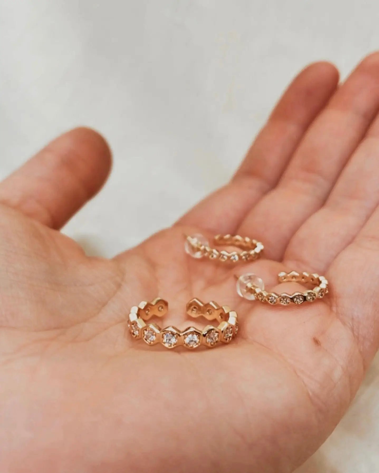 The perfect sized hoop, roughly the size of penny, with crystal embellishments around the entire ring. Pair it with the matching honeycomb ring for the complete look (ring and hoops pictured). Gold Filled, CZ Stones, Tarnish Free, Hypoallergenic.