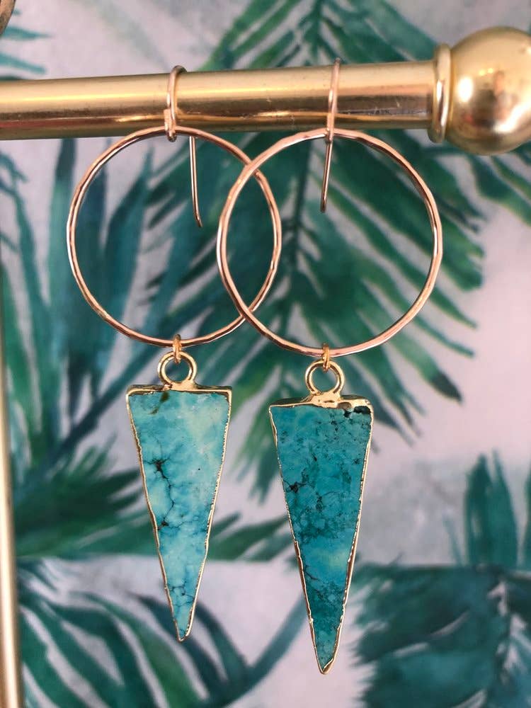 High quality 14k Gold Filled hoop and ear wire- shouldn’t irritate your ears! Hammered hoop, just how you guys like it :) Unique, one of a kind turquoise spike with dipped gold edges