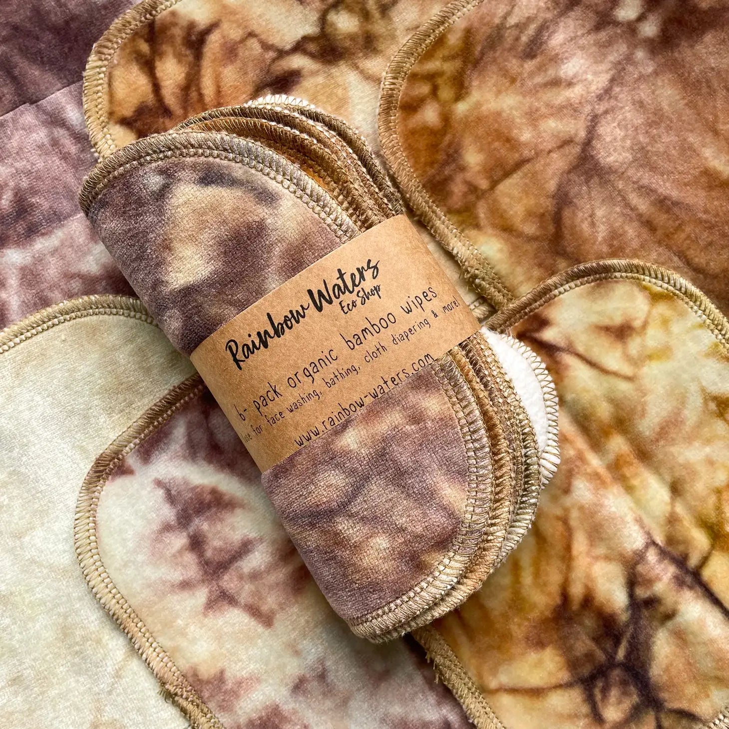 These super soft wipes are made with natural unbleached organic bamboo/cotton blend. One side is plushy organic cotton fleece and the other is smooth organic cotton velour. The Marble Dying process is done in house, and each pack of 6 is a grab bag of colors. This listing is for one 6-pack of tie-dye wipes. Perfect for baby wipes, family clothes, face washing, washcloths, removing makeup and much more. 6x6 rounded corner wipes. 70% bamboo 30% organic cotton