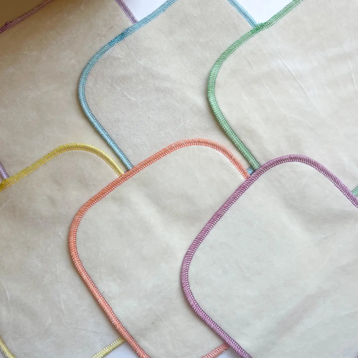 These super soft wipes are made with natural unbleached organic bamboo/cotton blend. One side is plushy organic cotton fleece and the other is smooth organic cotton velour. This listing is for one 6-pack of rainbow wipes. Perfect for baby wipes, family clothes, face washing, washcloths, removing makeup and much more. 8x8" rounded corner wipes. Material Content: 70% bamboo 30% organic cotton