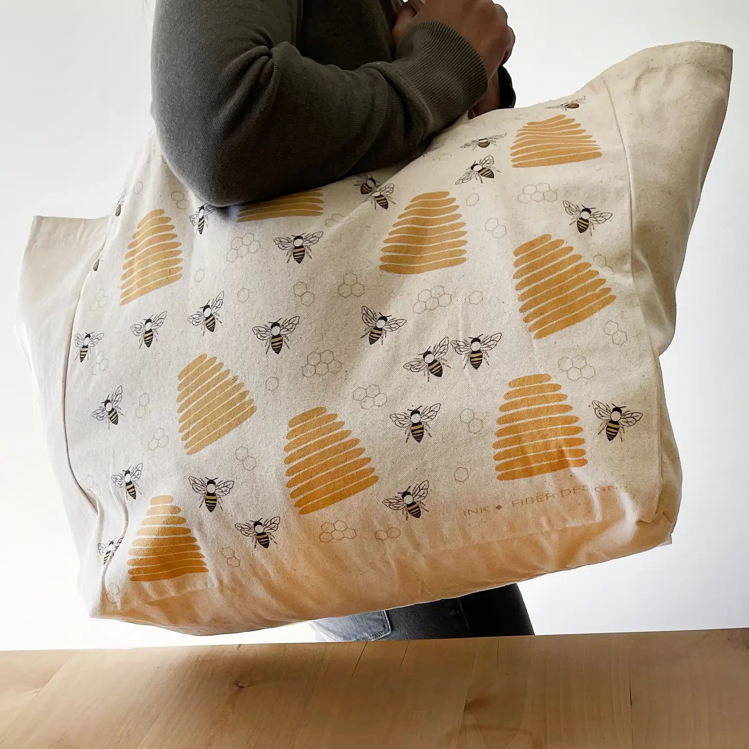 Made with durable 10oz Cotton Canvas fabric, this oversized bag is tightly woven in a plain weave style, resulting in a strong, yet softly textured fabric with no stretch. The perfect bag for the market, beach, library, life! 18 inches wide, 16 inches tall.  Huge 8 inch gusset! 100% Cotton. Screen Printed with Water based Ink. Machine wash cold. Lay flat to dry