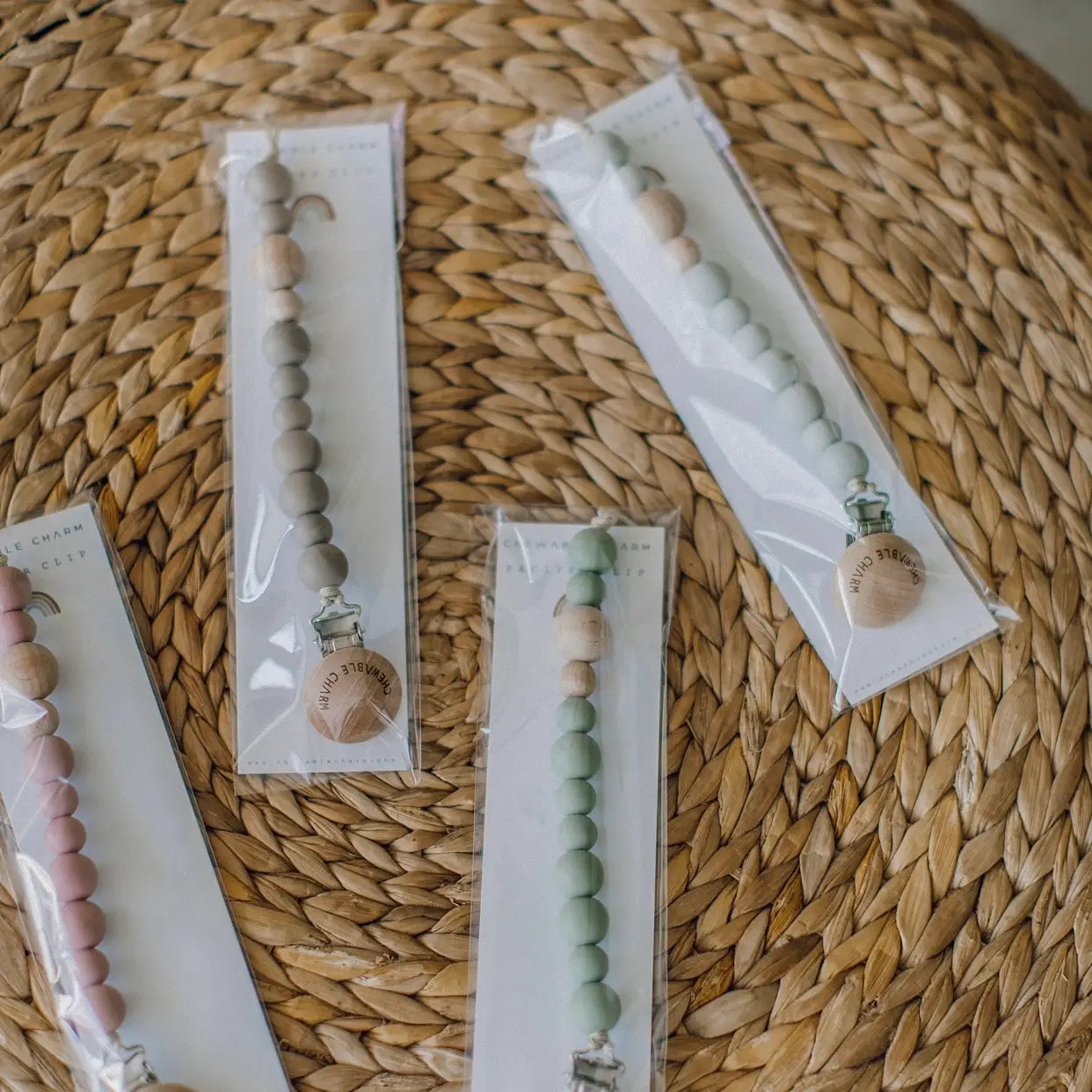 These pacifier clips are simple and the perfect accessory. Tie any type of pacifier or teether/ toy through the loop and stop playing the pick up off the floor game every 2 minutes! They are lovely + practical and can double as teethers, but always require adult supervision. All Products come in packaging with materials, cleaning and safety details. Materials: - Food Grade Silicone beads - Stainless Steel Clip - Beechwood