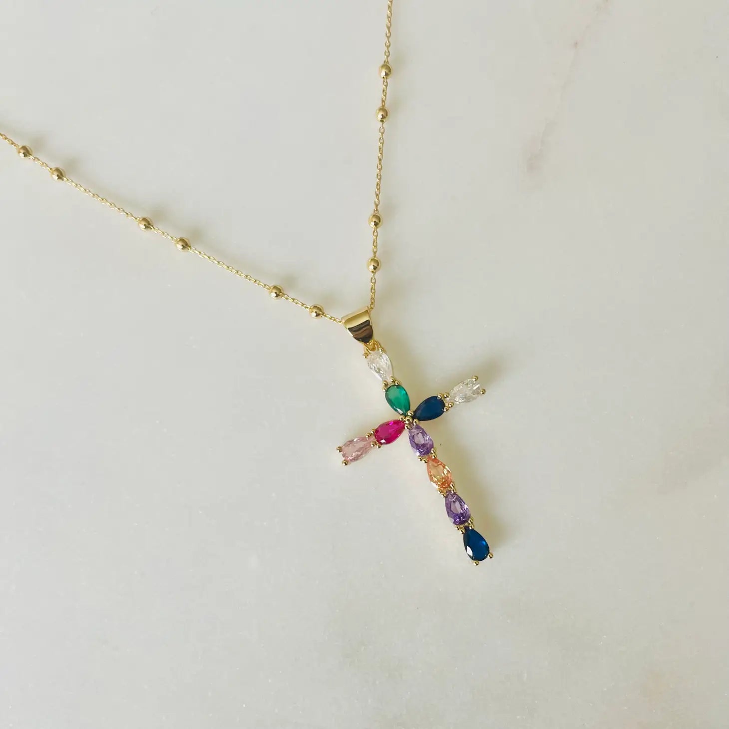 Multicolored Stone Cross Necklace, 18” Satellite chain