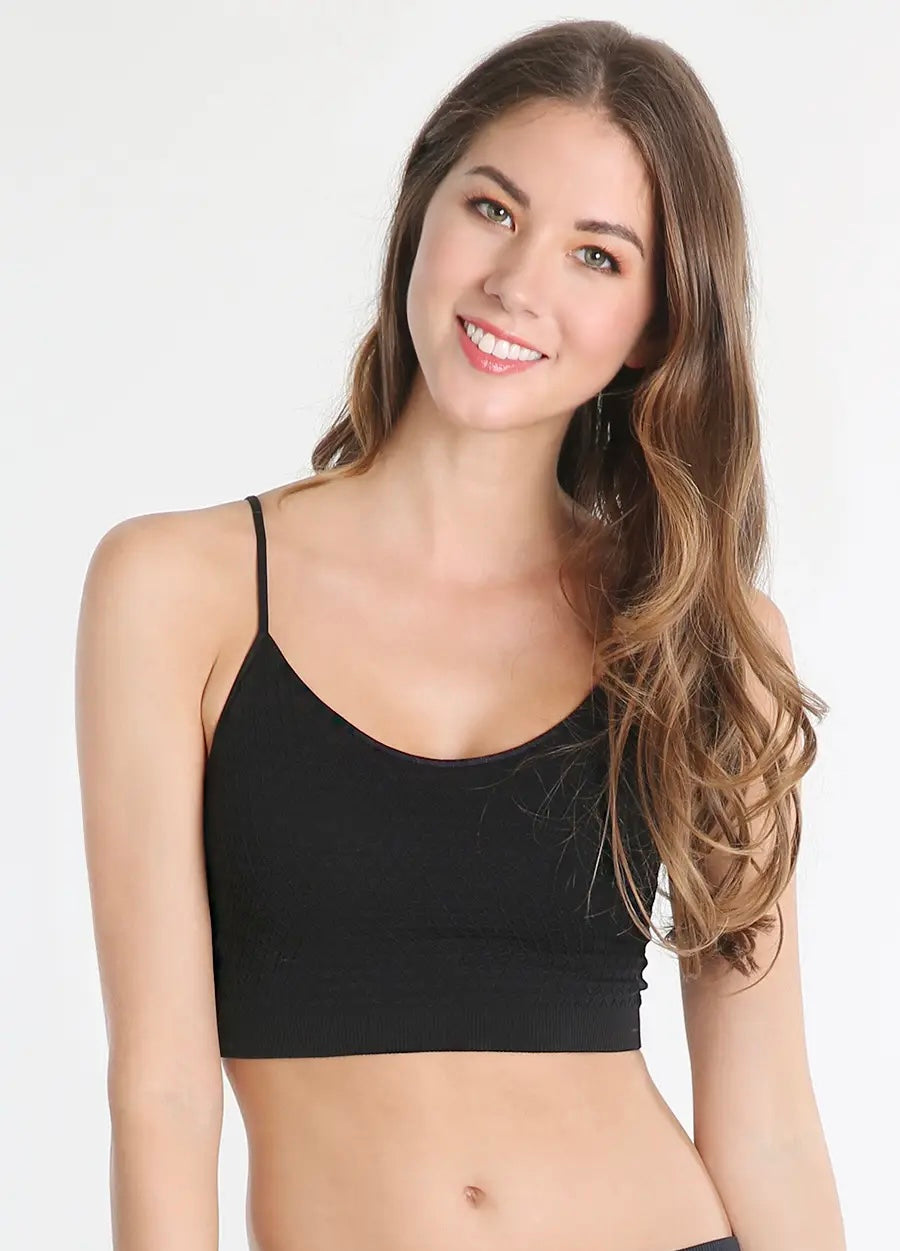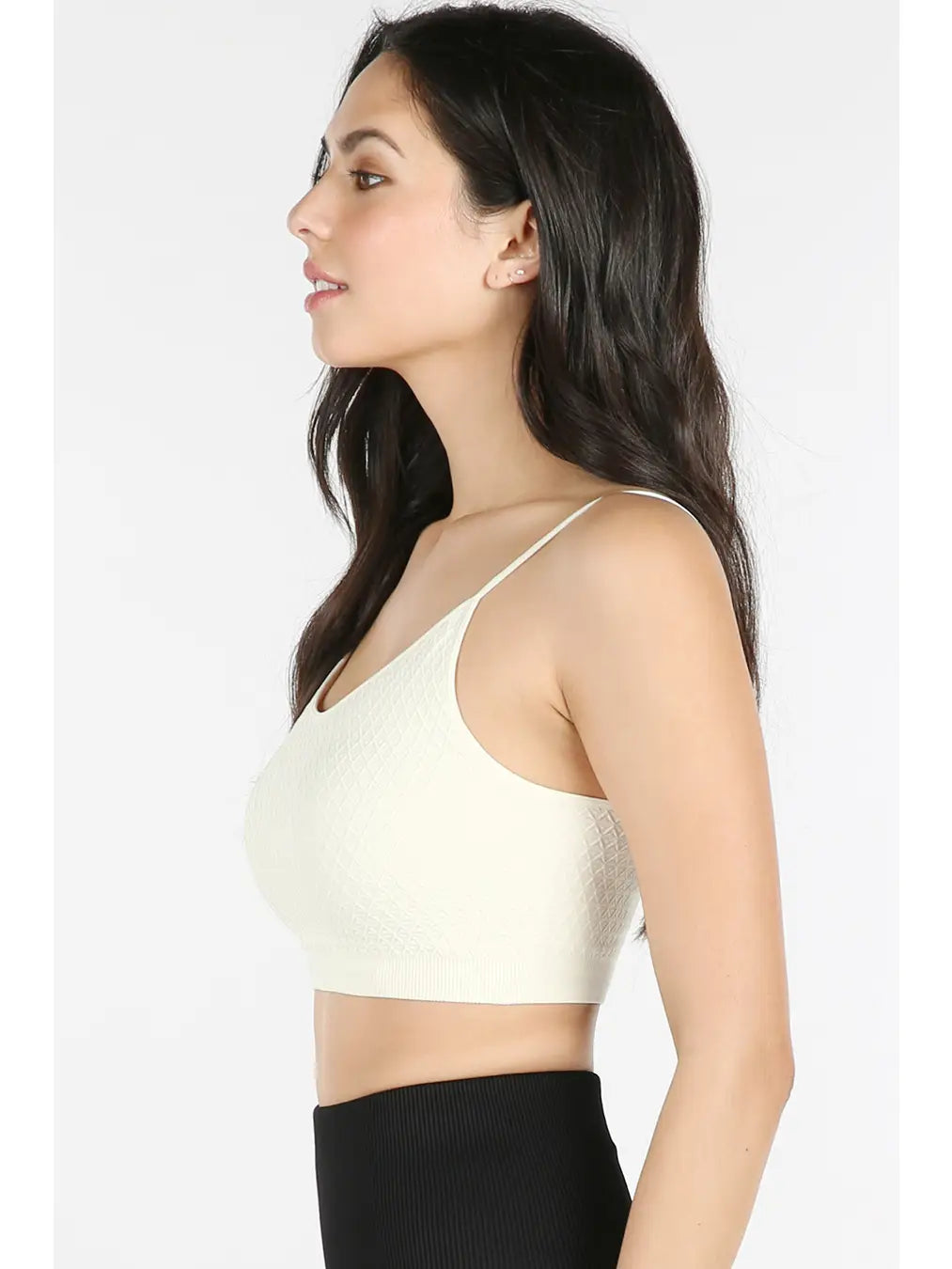 Size: One Size. Seamless bralette with diagonal textured design. Fabric: 92% Nylon / 8% Spandex. Made in the USA