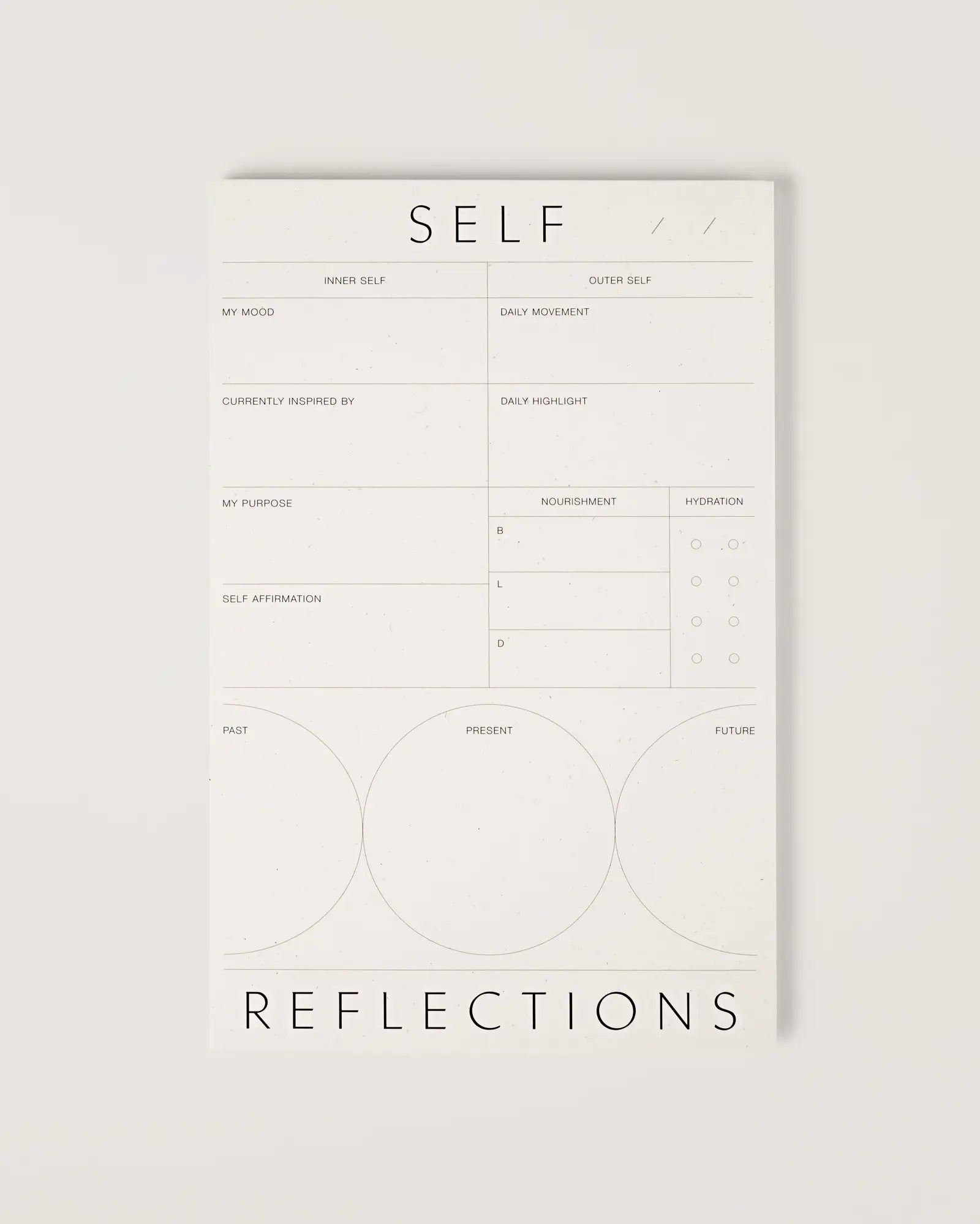 A lightly guided pad intended to carve out space to pause and take inventory of your inner and outer self. By putting words to your emotional state and by checking in with your physical well-being, the Self Reflections Pad connects you with your current self and allows you to align with a path forward. 5.5’’ x 8.5’’ 50 sheets. Printed on luxe recycled stock made from 30% post-consumer waste. Thick chipboard backing