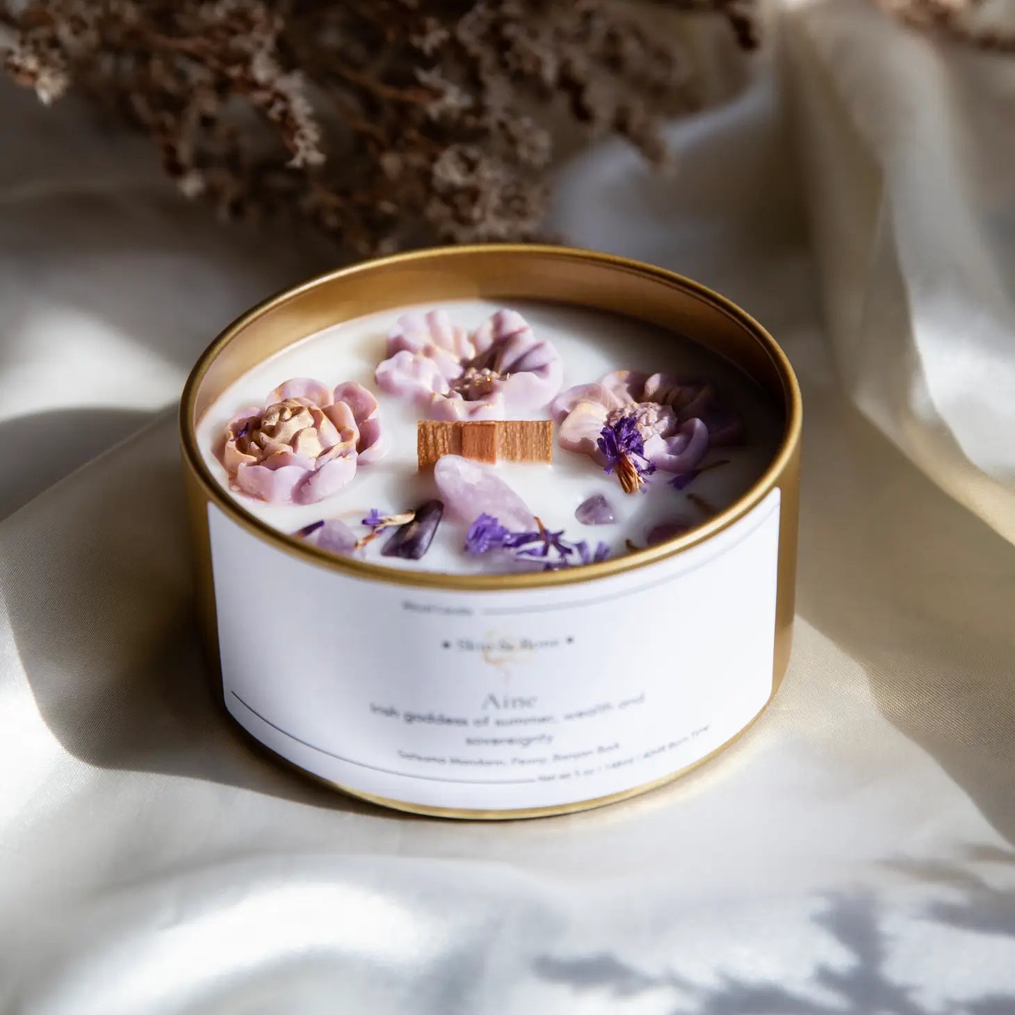 Aine is an Irish goddess of summer, wealth and sovereignty. She is associated with midsummer and the sun. In Irish mythology, Áine is depicted as the faery Queen, goddess of the moon, goddess of the earth and nature, and a lady of the lake. It is said that Áine taught humans the meaning of love and brought luck and blessings to them. Topped with lepidolite crystals and linen musk floral molds