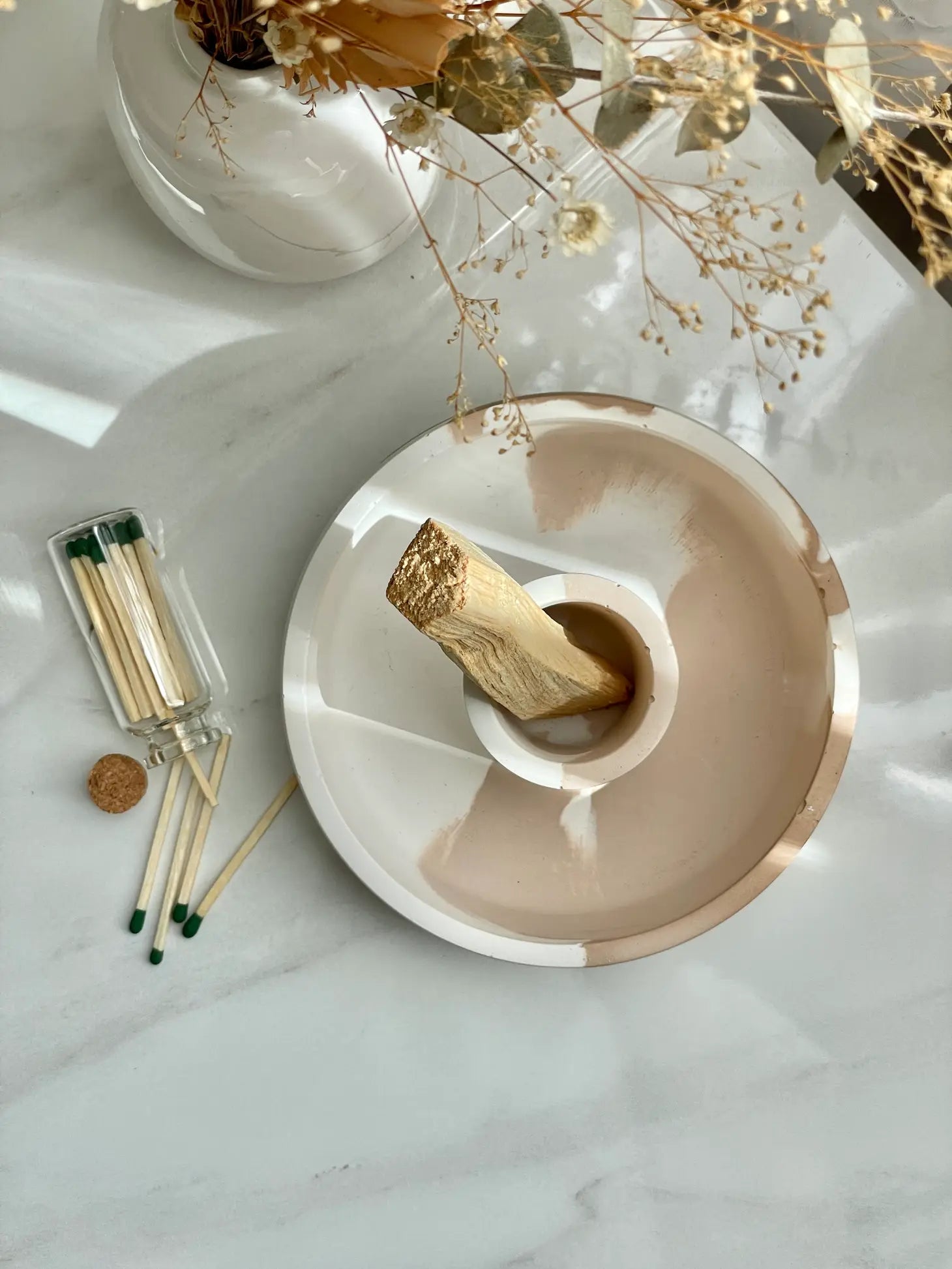 This beautiful cement handcrafted tray is perfect for all your Palo Santo + Smudging needs! Due to the handmade nature, imperfections are expected and add to the uniqueness of each piece. Especially when it comes to marble artwork, each pour will be different and certainly different from the photo take. Enjoy each handmade piece! Photographed is Eggshell + Coffee