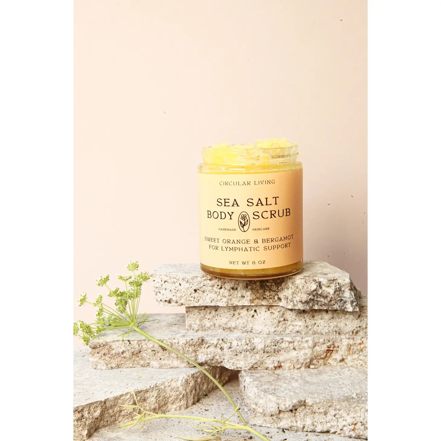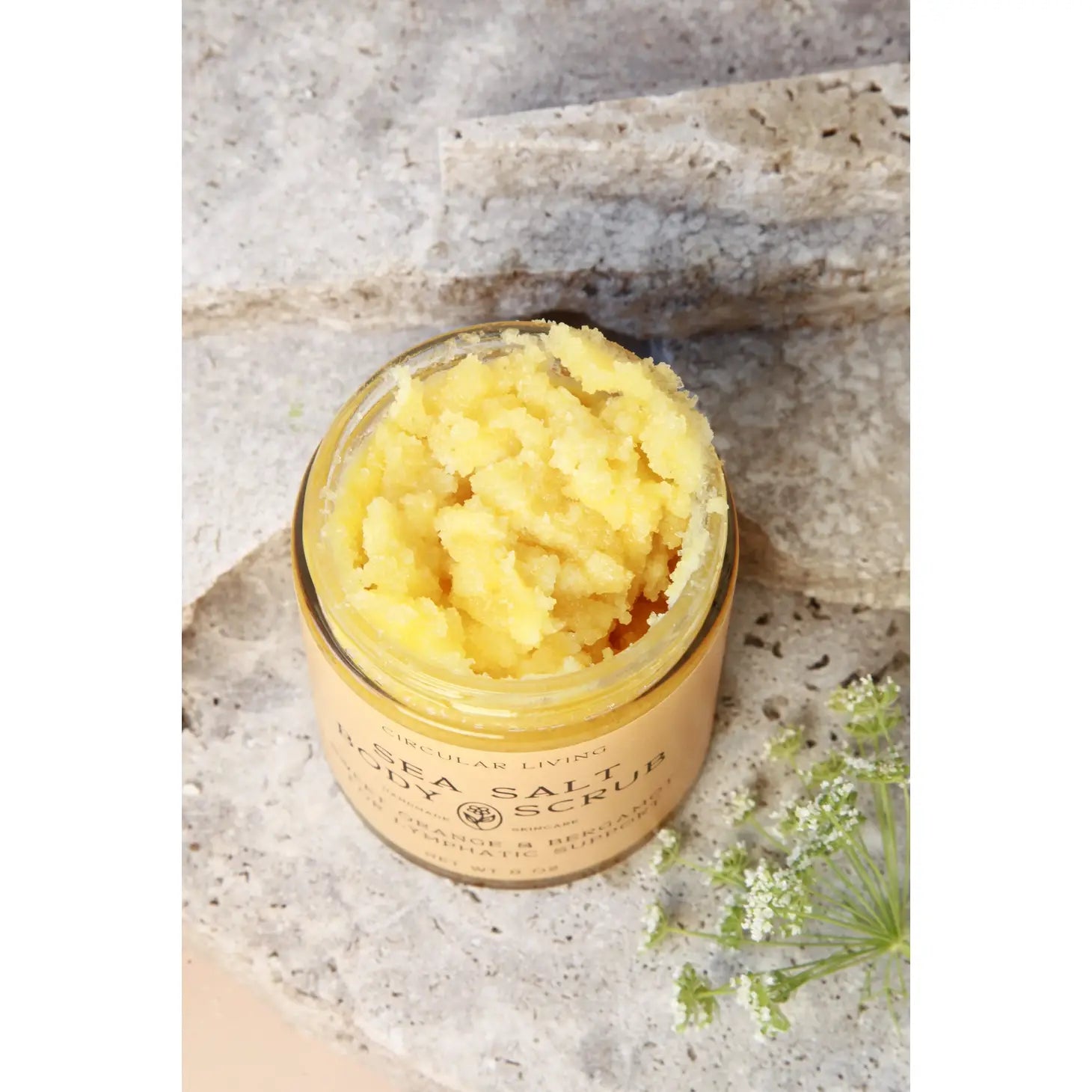 An antioxidant rich mineral scrub to exfoliate skin and support lymphatic health.  8 oz 〰 Ritual: Gently massage scrub in a circular motion towards the heart and rinse. Do not use on face, or introduce water to the jar.  Ingredients: sodium chloride (sea salt from the California coast), *saccharum officinarum (cane sugar), *helianthus annuus (sunflower) seed oil infused with *calendula officinalis (calendula) flower, *simmondsia chinensis (jojoba) seed oil, *ricinus communis (castor) seed oil, *+butyrospermum park (shea) fruit butter, *hippophae rhamnoides (sea buckthorn) co2 oil, *citrus sinensis (sweet orange) oil, *citrus aurantifolia (lime) oil, *citrus bergamia (bergamot) oil  *Organic Ingredient  +Fair Trade Ingredient
